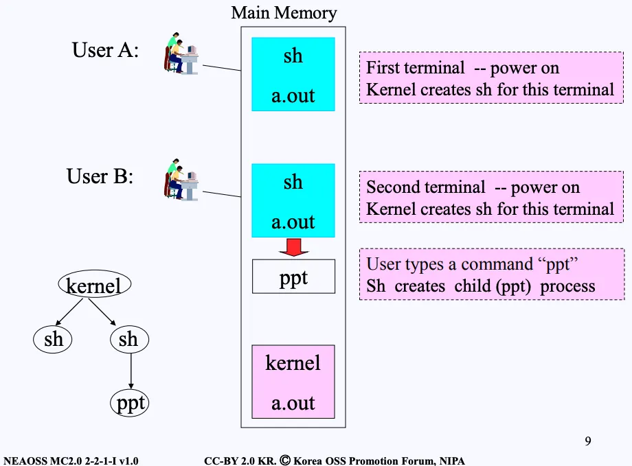 또한 Linux의 경우 multi-user System이기 때문에 여러 사용자가 동시에 접근할 수 있습니다. user a와 user b가 각 각 sh을 실행하고 sh을 실행하기 위한 자원(Memory, CPU, Disk, etc…)을 사용합니다.