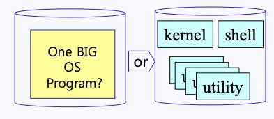 OS의 경우도 동일합니다. 모든 기능이 존재하는 하나의 큰 프로그램이 아니라 기능에 맞게 프로그램을 kernel, shell, utility로 분할하여 사용합니다.