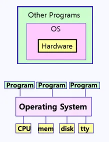 운영체제(OS, Operating System)는 사용자의 프로그램과 하드웨어 사이에 존재하며, 사용자가 사용하는 하드웨어 자원(CPU, Memory, disk, tty)을 관리하여 사용자 프로그램이 작동할 수 있도록 관리하는 추상화된 인터페이스를 제공하는 프로그램입니다.
