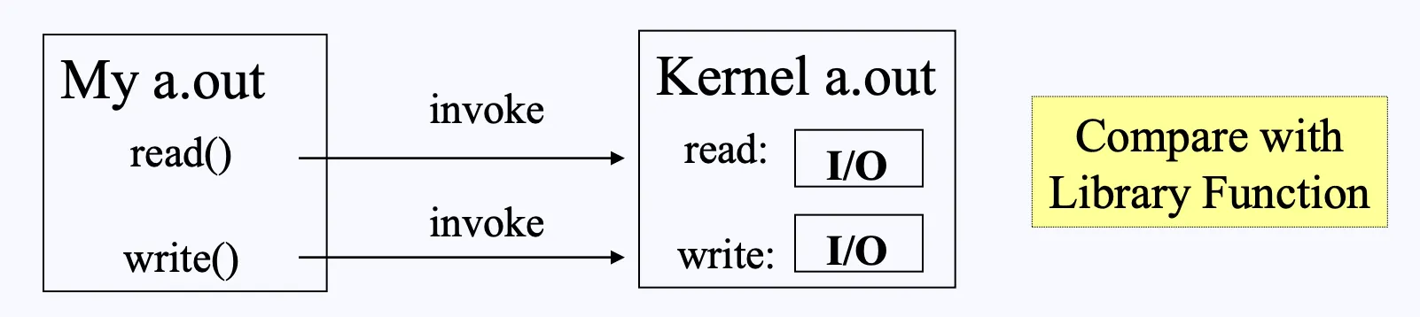 우리가 I/O와 같은 작업을 요청하면, 컴파일러는 이를 read, write와 같은 libc 함수를 호출합니다.