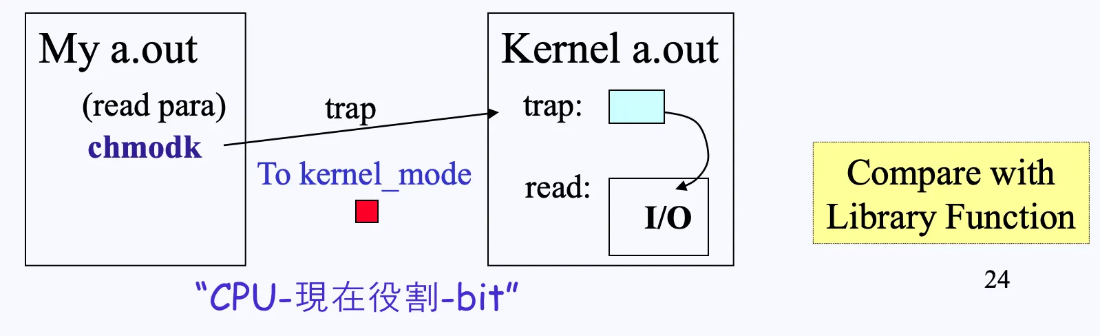 CPU의 Mode Bit가 어떻게 사용되는지 보겠습니다. Mode Bit가 1이면 커널 모드, 0이면 사용자 모드라고 가정하겠습니다.