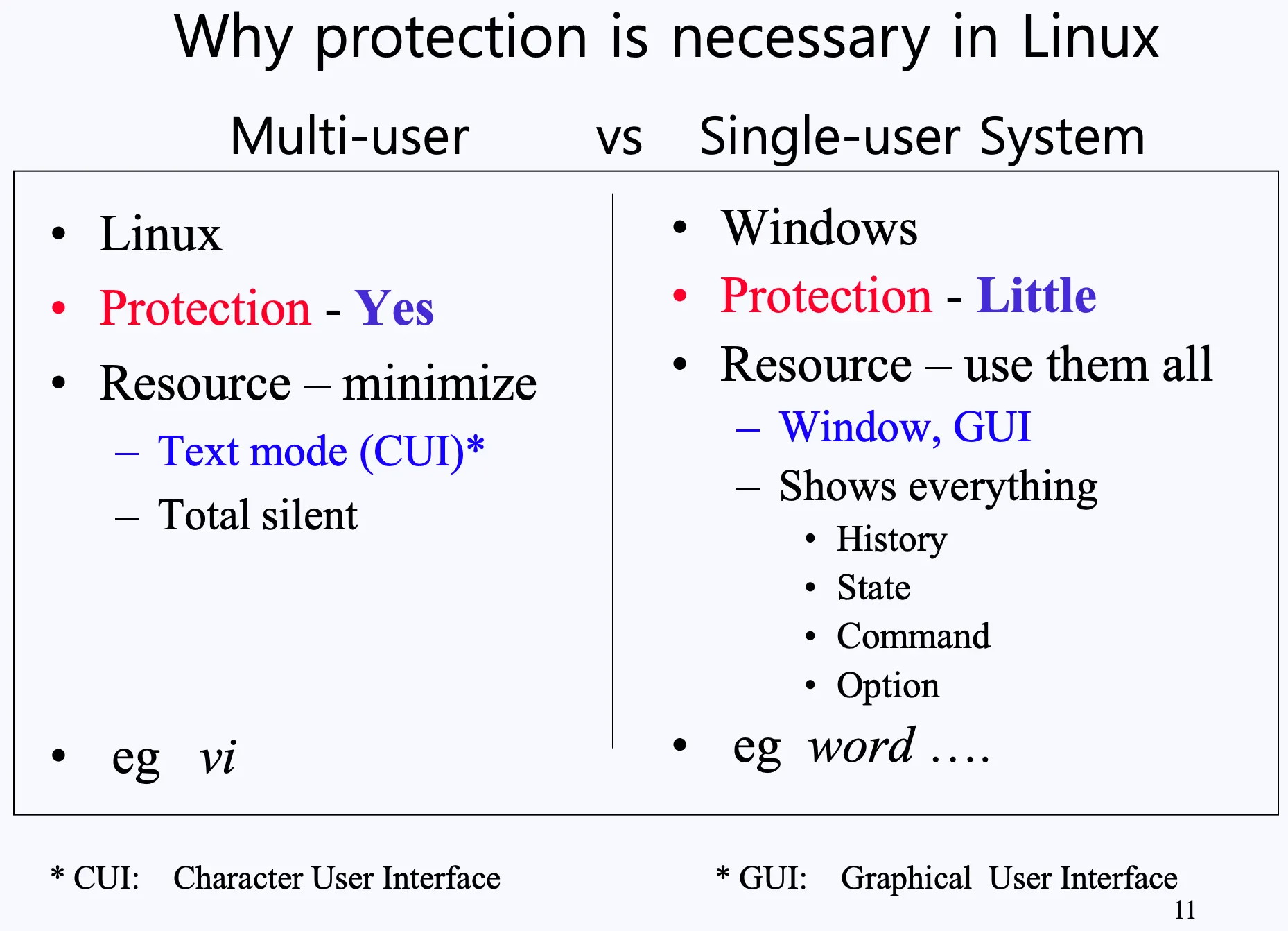 초기 운영체제를 개발할 때 이야기지 지금은 Window와 Linux 모두 Multi-user를 고려하여 개발되었고, 각 운영체제마다 잘 어울리는 시스템과 환경이 존재하여 고려해 사용하면 됩니다.
