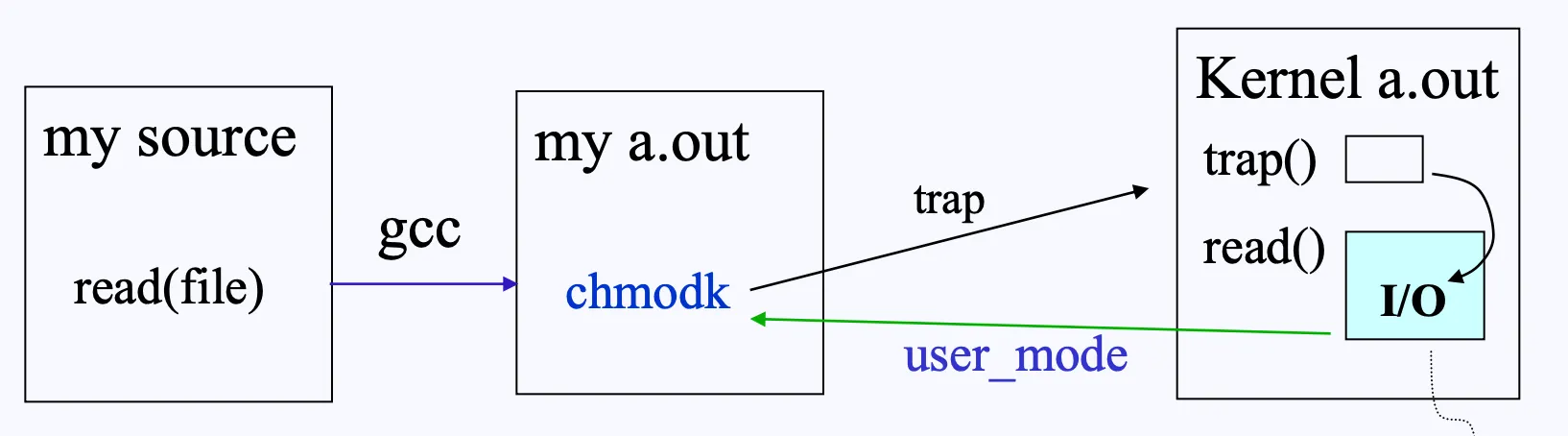 우리가 C로 코드를 짜면 사용자 모드로 실행되는 프로그램인데도 read, write와 같은 파일 I/O를 할 수 있습니다.