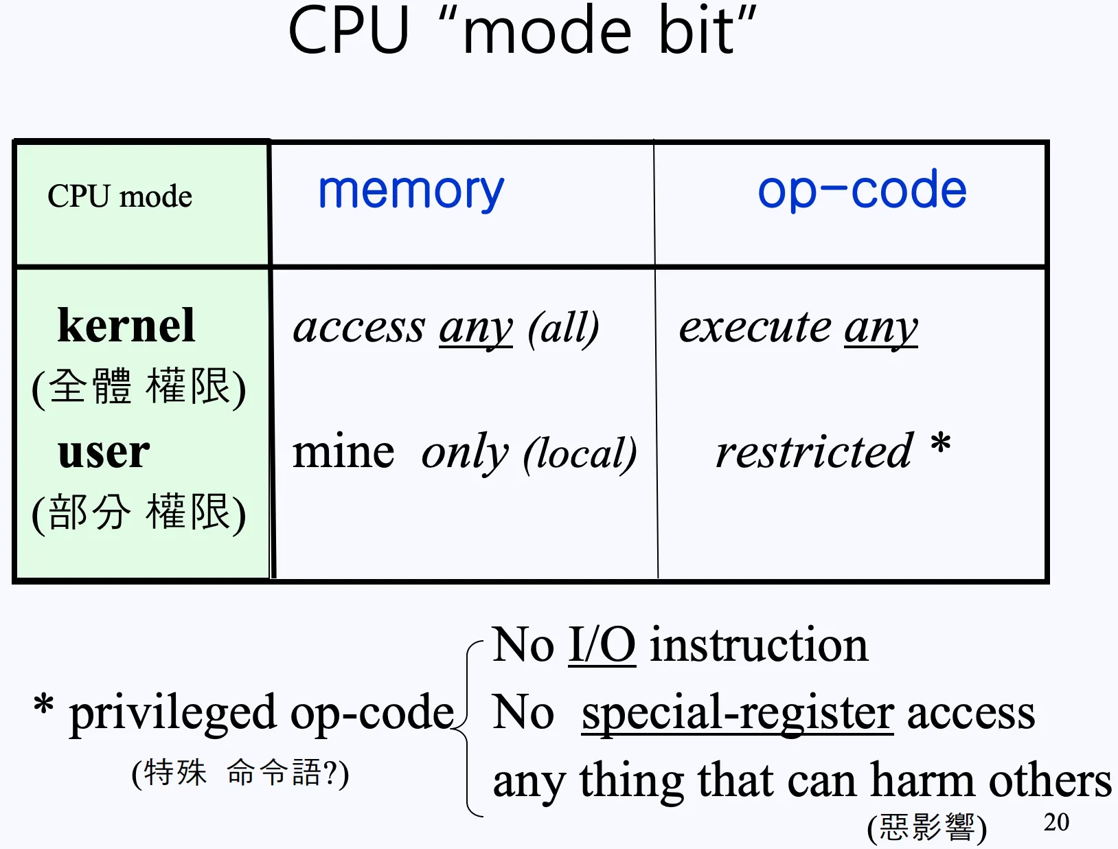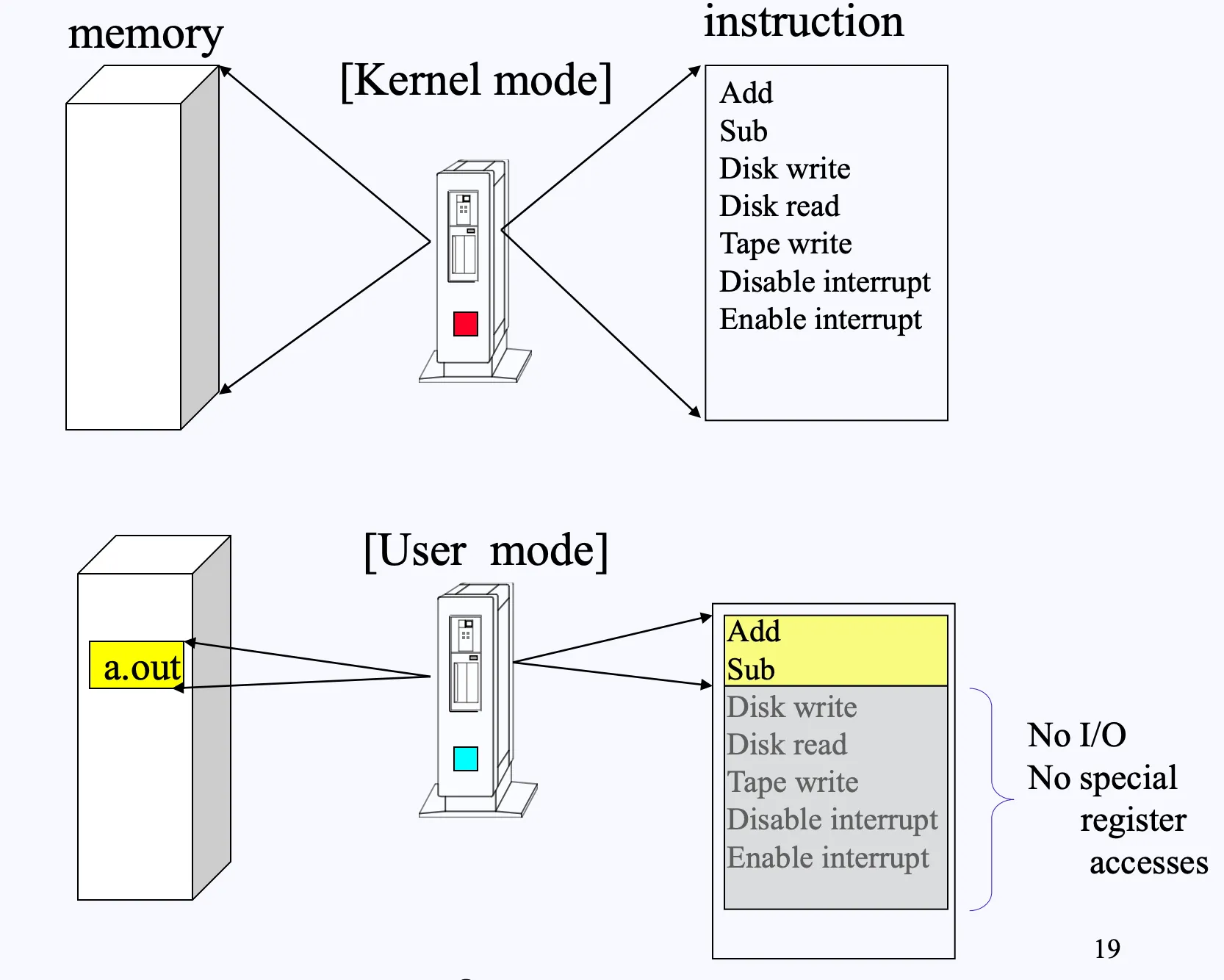 커널 모드가 설정되어 있다면 모든 특권 명령어(privileged instruction)를 실행할 수 있지만, 사용자 모드의 경우 I/O 접근이나 시스템 제어와 관련된 특권 명령어(privileged instruction)는 실행이 허용되지 않습니다.