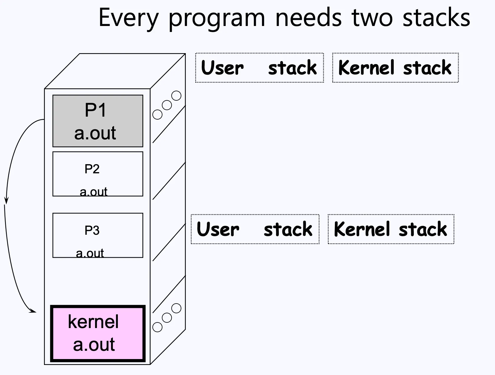 따라서 각 프로세스는 사용자 스택(User Stack)과 커널 스택(Kernel Stack)을 각각 하나씩 총 2개를 사용합니다.