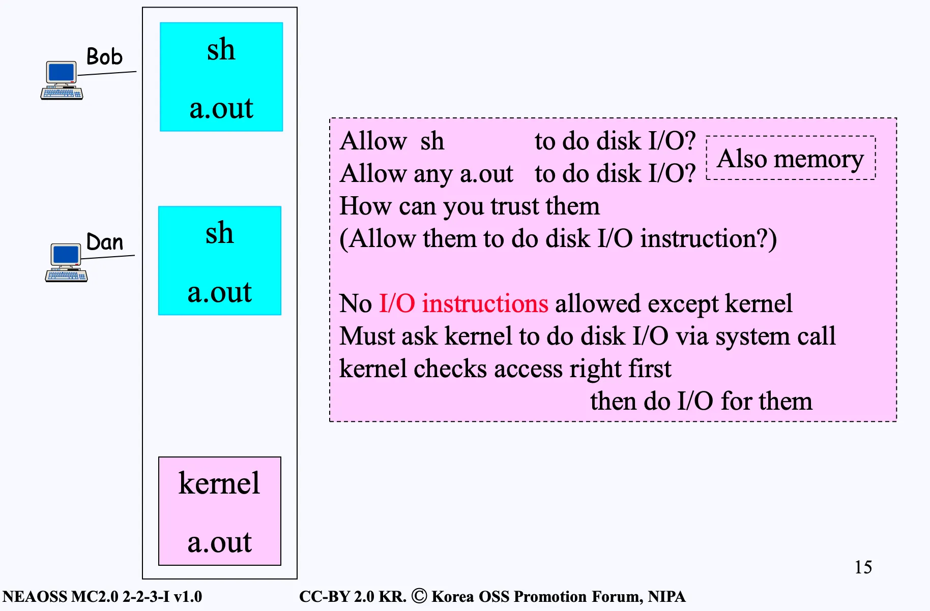 모든 사용자 프로세스는 CPU 안에서 명령어(Instruction)가 실행될 때, I/O가 필요한 명령어와 같은 특권 명령어(privileged instruction)를 실행할 수 없도록 CPU가 fault 또는 exception을 발생시킵니다.