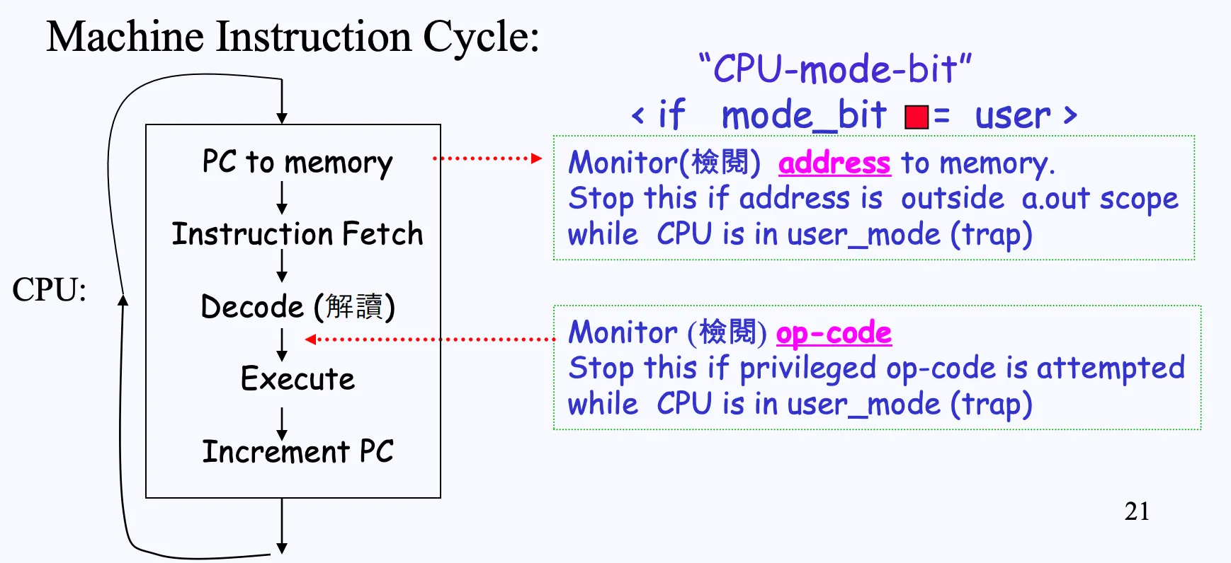 메모리 주소로부터 실행할 명령어를 가져와 Decode 한 뒤,opcode를 보고 특권 명령어(privileged instruction)인지 아닌지 검사하고 실행하게 됩니다.