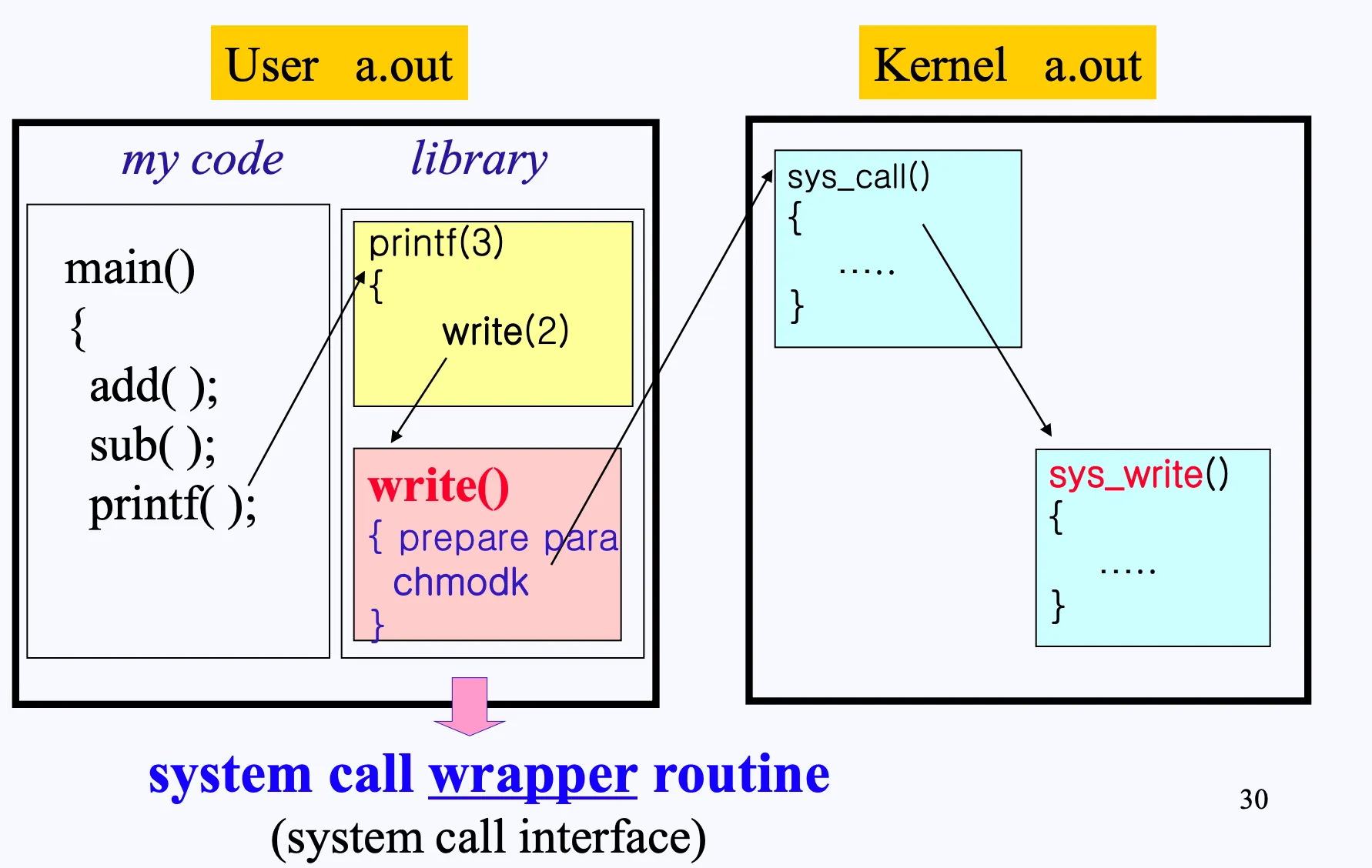 write와 같이 system call을 호출하여 커널 기능을 사용할 수 있도록 감싸는 함수를 wrapper 함수라고 부릅니다.