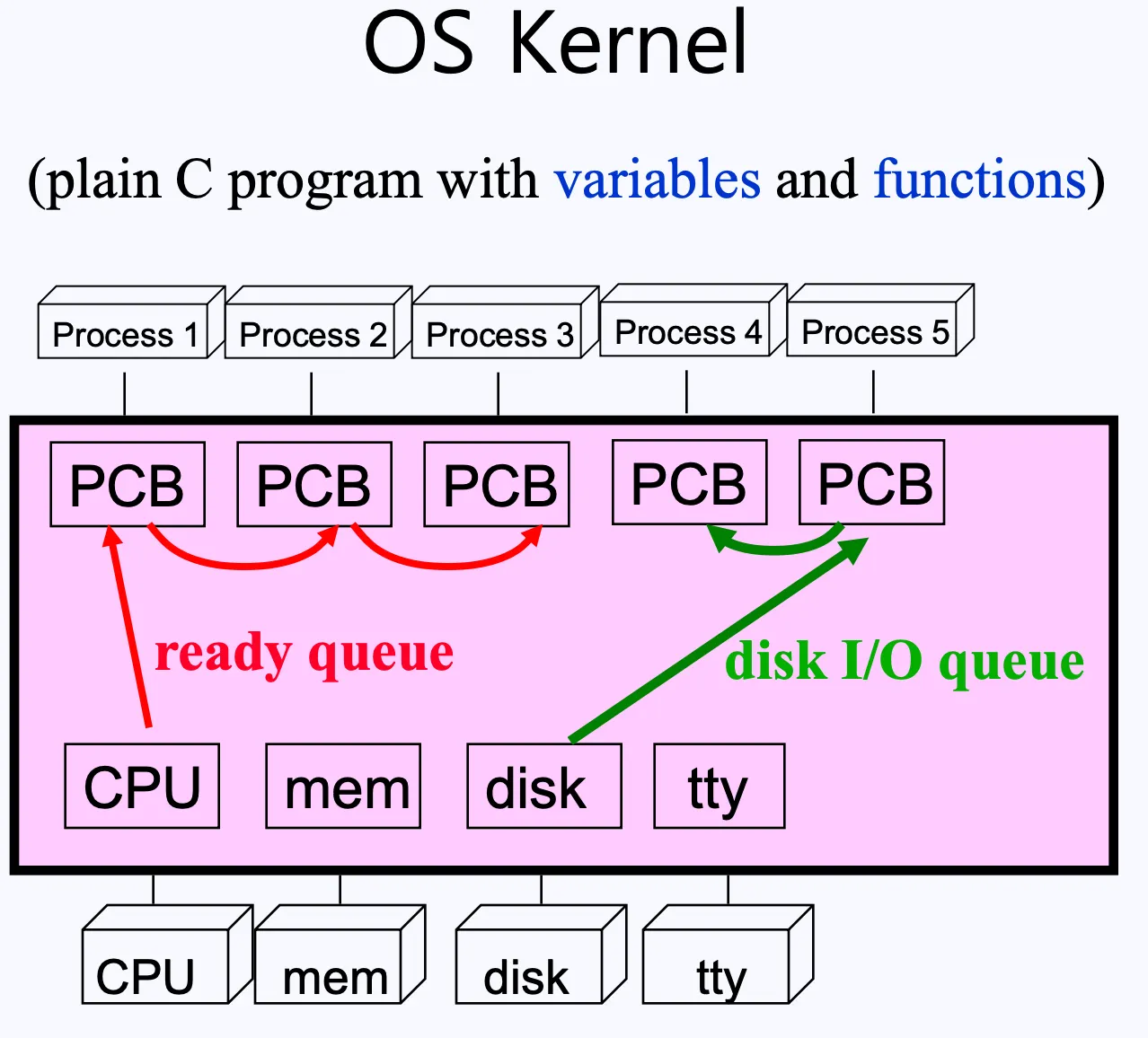 커널은 PCB에 저장된 정보를 가지고 프로세스를 스케줄링하며, 사용자 프로그램의 실행 흐름을 제어하고 사용자 프로그램과 하드웨어 사이에서 자원 접근을 중재합니다.