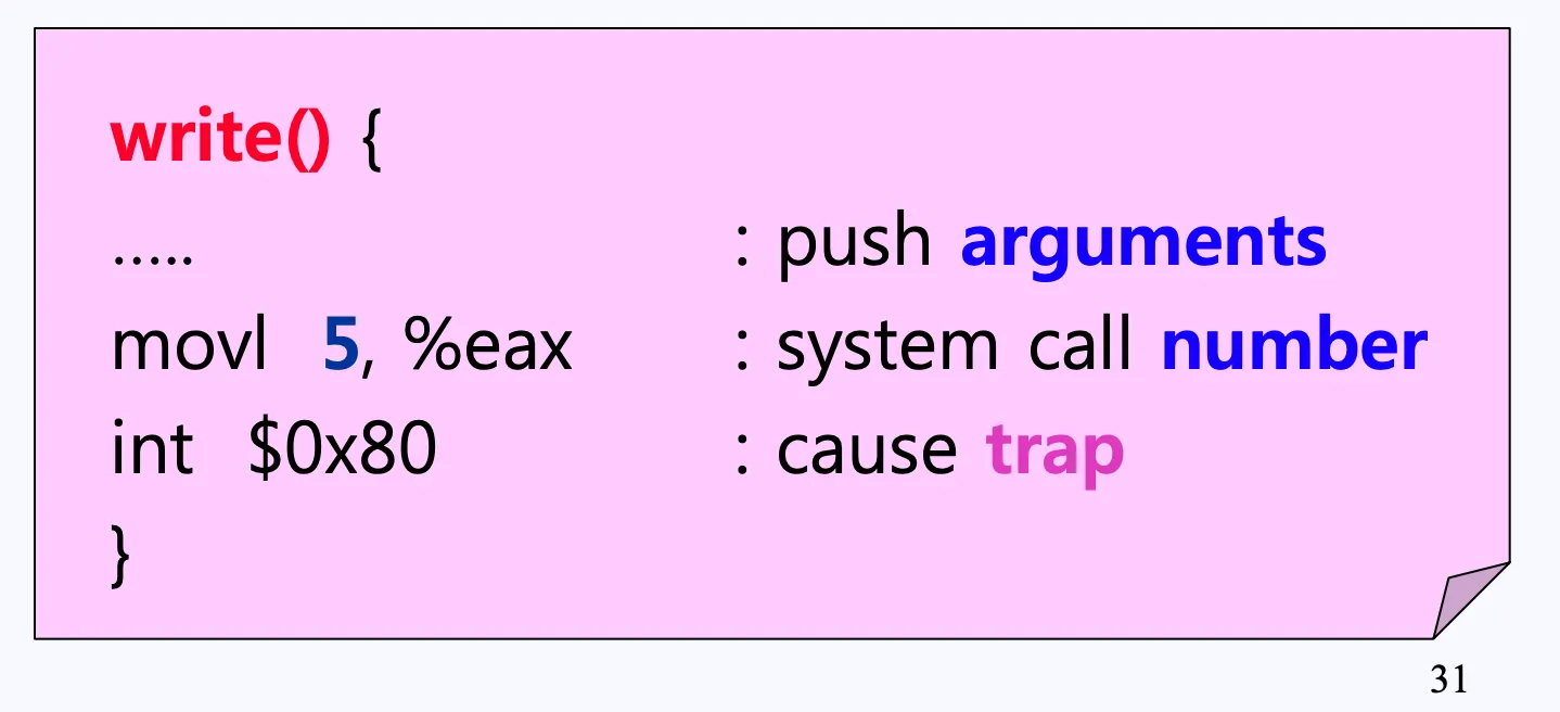실제 아래 write 코드를 보면 movl 5, %eax; int $0x80;으로 이루어져 있는데, int 0x80은 32bit system call이고 syscall은 64bit system call이라고 보면 됩니다.