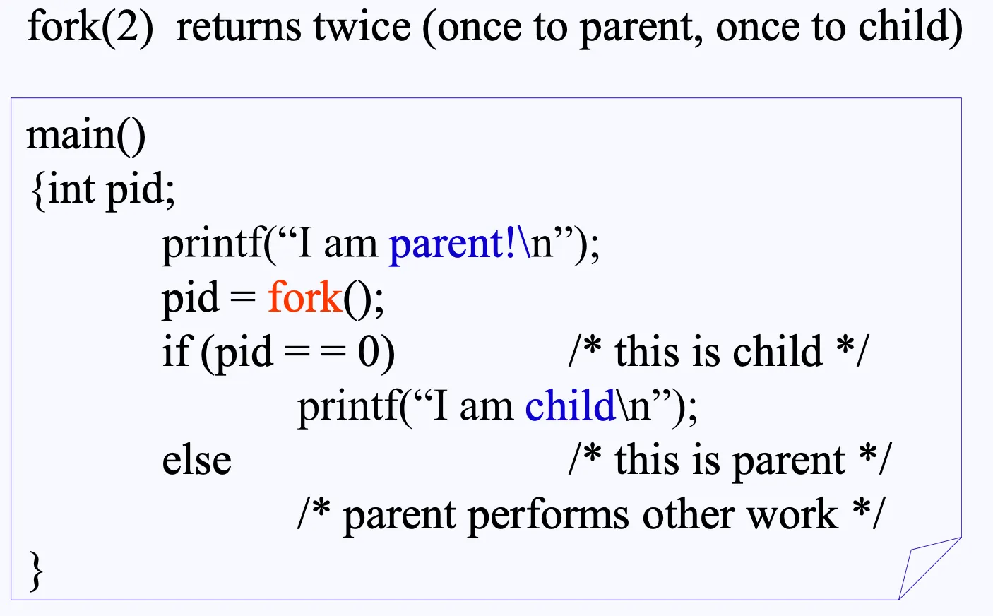 fork의 리턴 값은 2개의 프로세스가 됩니다.