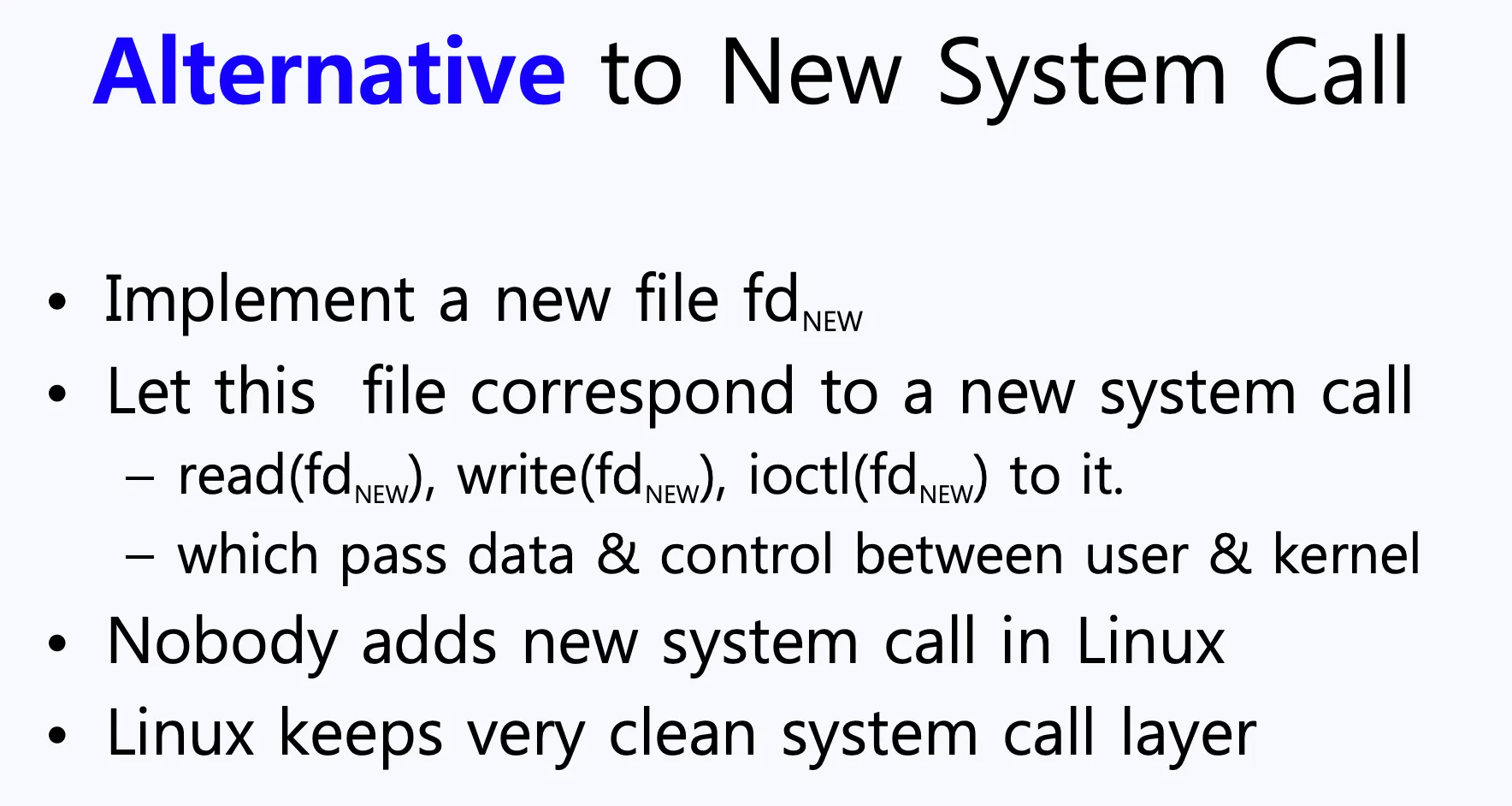 따라서 새롭게 system call을 만드는 것이 아니라, read, write, ioctl 등을 이용하라고 합니다.