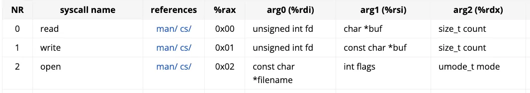 Linux에서 호출 가능한 system call과 전달되어야 하는 인자는 아래의 사이트에서 확인이 가능합니다.