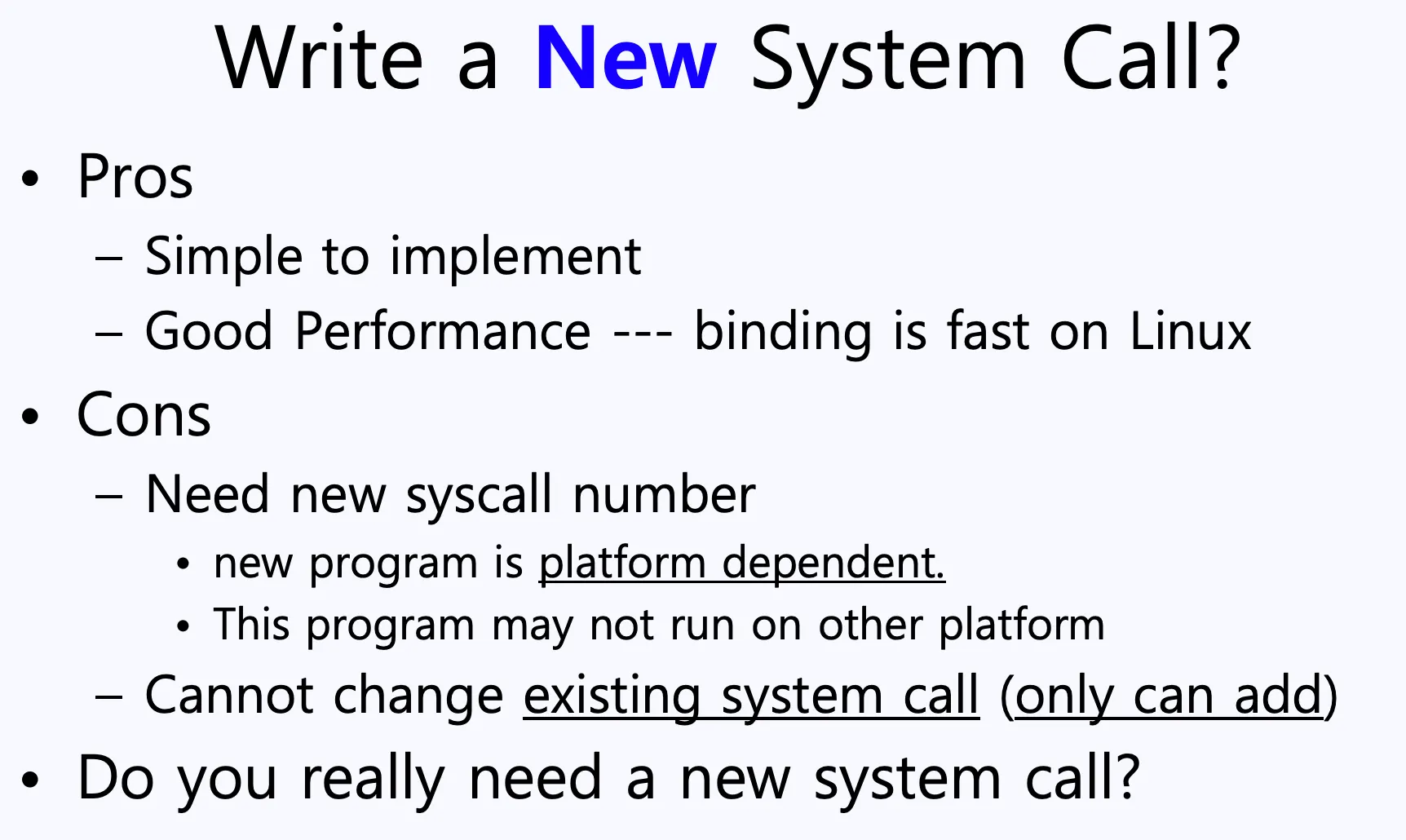 결론부터 말하면 새로운 system call을 추가하는 것은 추천하지 않습니다.