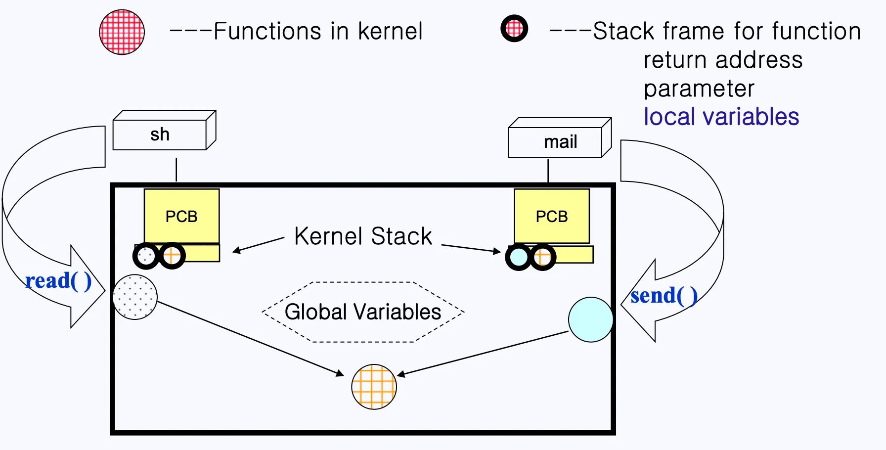 커널 함수에서 지역 변수(Local Variable)에 접근하는 경우, 각 테스크는 개별 커널 스택을 사용하여 경쟁 상태(race condition)가 발생하지 않습니다.