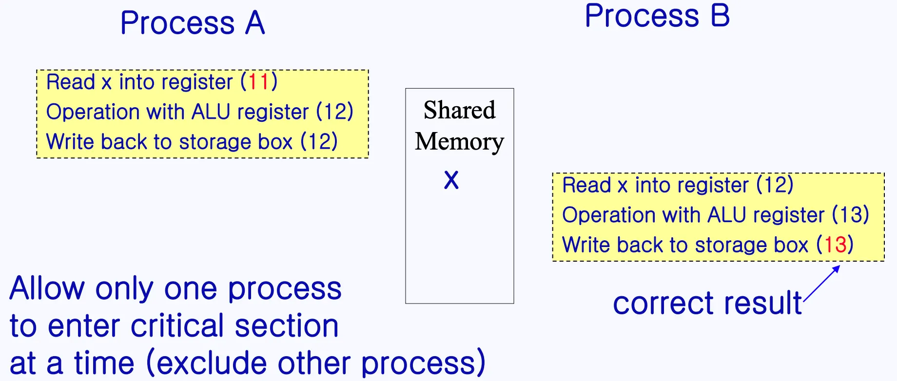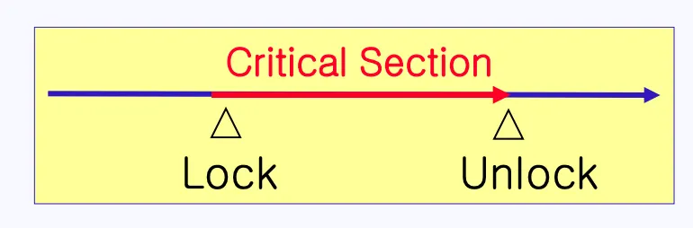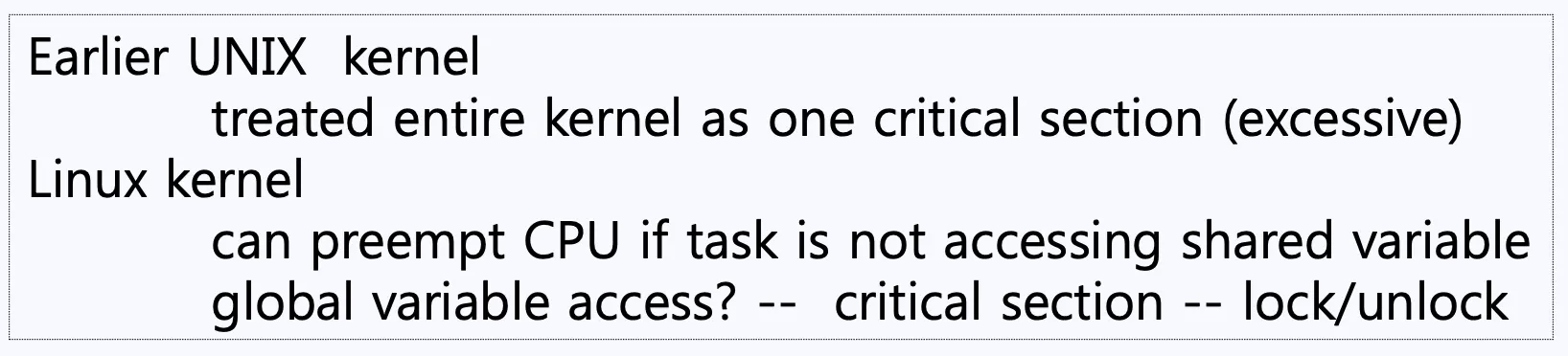 반면 전역 변수(Global Variable)와 같이 커널 내에서 공유되는 데이터에 접근하는 경우, 해당 코드 영역은 임계 구역(critical section)이 됩니다.