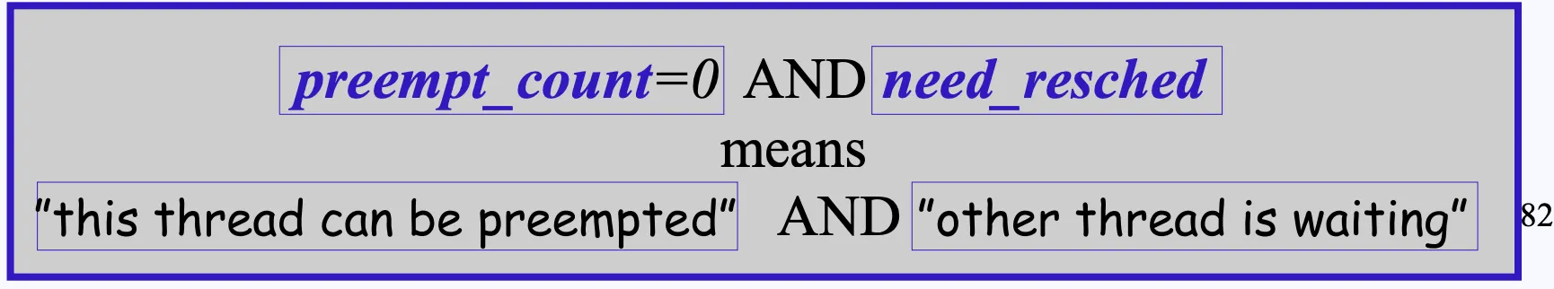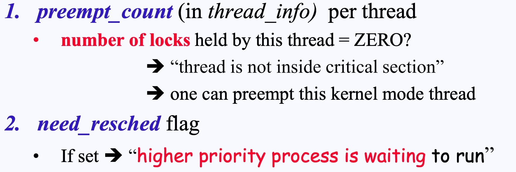 이는 task_struct 구조체의 경우 접근 비용이 크기 때문에, 스케줄링 가능 여부는 빠르게 접근 가능한 thread_info 구조체를 통해 preempt_count 카운터와 need_resched 플래그를 확인합니다.