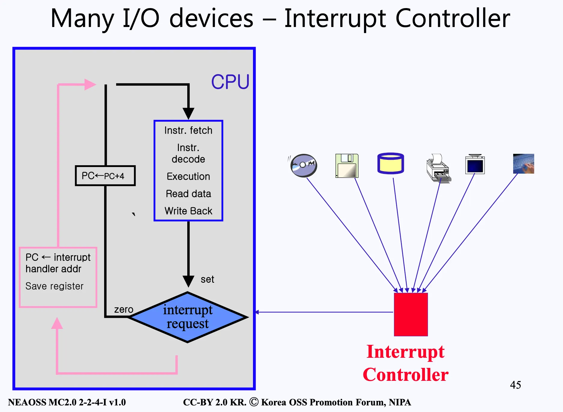 이를 방지하기 위해 커널은 Interrupt Controller를 두어, 여러 디바이스에서 발생하는 인터럽트를 일괄적으로 관리하고 CPU에 전달하도록 설계합니다.
