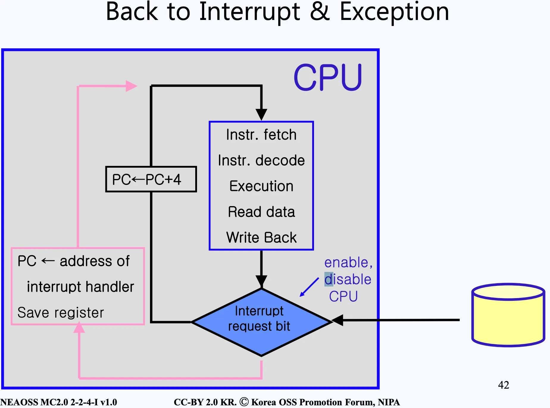 이때 인터럽트(interrupt)가 발생하면 CPU는 내부에 Interrup request bit를 1로 설정되어 있으면, 현재 실행 상태(레지스터 값 등)를 저장한 뒤 PC를 인터럽트 핸들러 주소로 변경합니다.