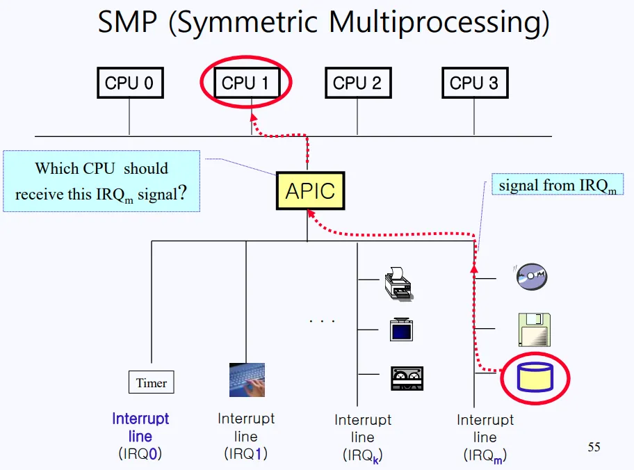 아래 그림과 같이 disk에서 인터럽트 요청이 발생하면, APIC는 어떤 CPU에게 인터럽트 처리를 전달할 지 결정하기 위해 로드 밸런싱을 수행해야 합니다IRQ .