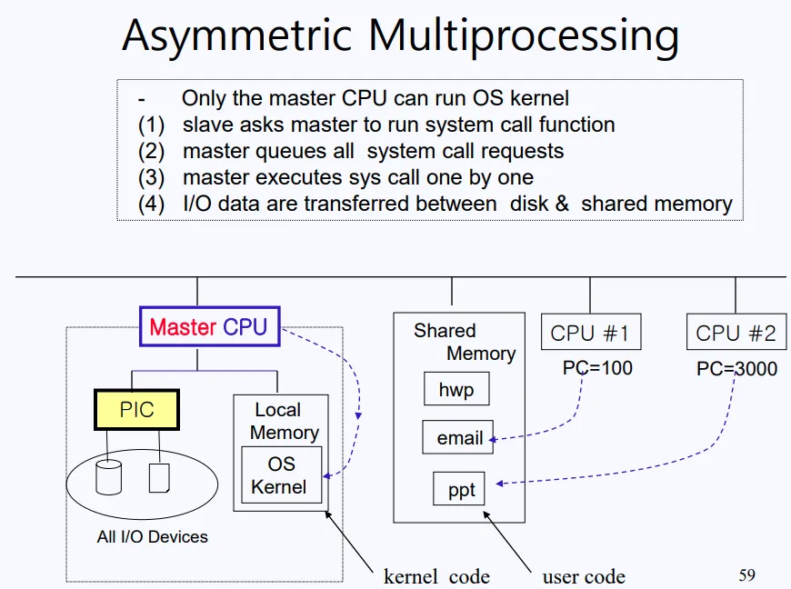 비대칭 멀티프로세싱(AMP)은 하나의 Master CPU만 커널과 I/O를 처리하고, 나머지 CPU들은 사용자 코드만 실행하는 비대칭 구조를 가집니다.