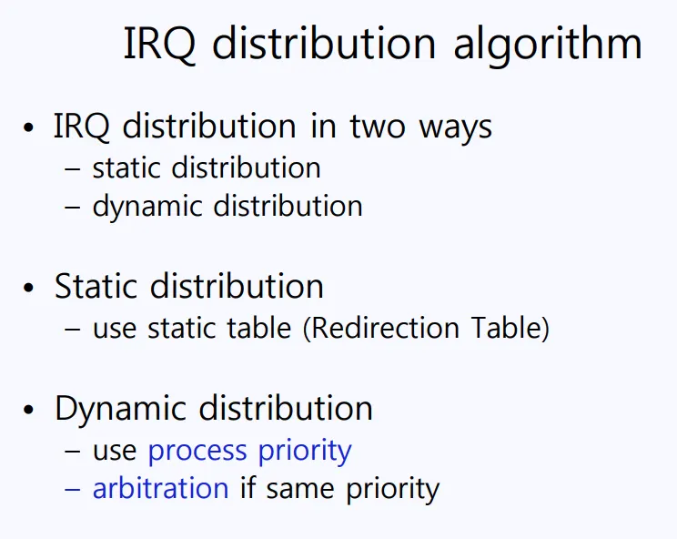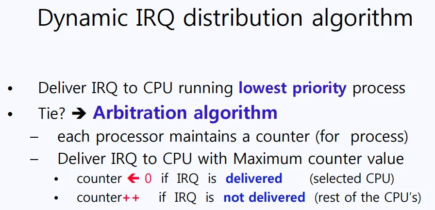 IRQ는 가장 낮은 우선순위 프로세스를 실행 중인 CPU로 전달됩니다. 만약 CPU가 동일한 우선순위 프로세스를 실행 중인 경우 Arbitration algorithm을 수행합니다.