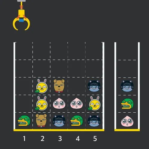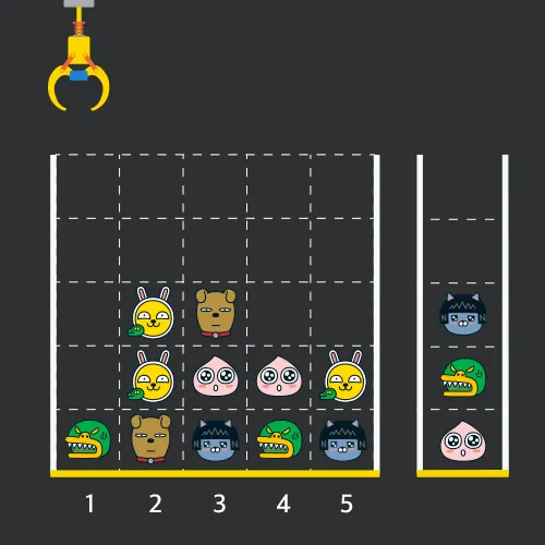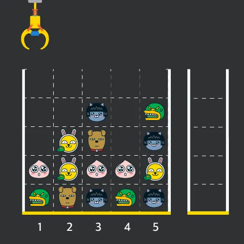 게임 화면은 "1 x 1" 크기의 칸들로 이루어진 "N x N" 크기의 정사각 격자이며 위쪽에는 크레인이 있고 오른쪽에는 바구니가 있습니다. (위 그림은 "5 x 5" 크기의 예시입니다). 각 격자 칸에는 다양한 인형이 들어 있으며 인형이 없는 칸은 빈칸입니다. 모든 인형은 "1 x 1" 크기의 격자 한 칸을 차지하며 격자의 가장 아래 칸부터 차곡차곡 쌓여 있습니다.