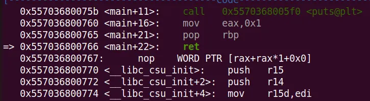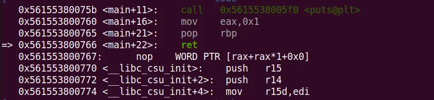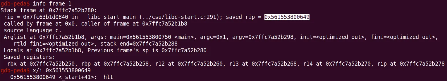 saved rip가 0x561553800649이며, _start+41인 것을 확인할 수 있습니다.