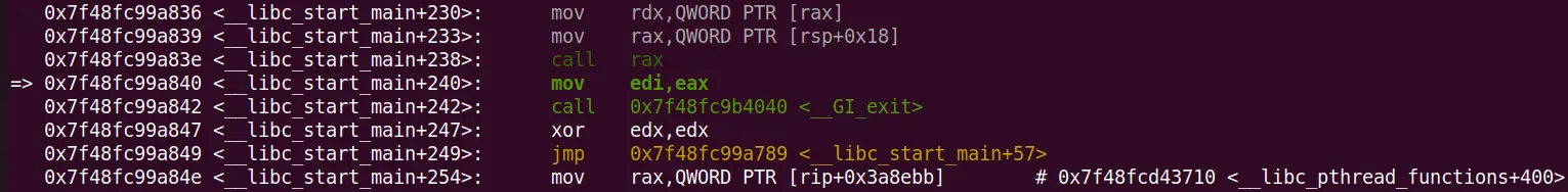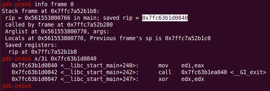 info frame 명령어를 통해서 saved rip가 0x7fc63b1d0840인 것을 확인할 수 있고 이는 __libc_start_main+240의 주소입니다.