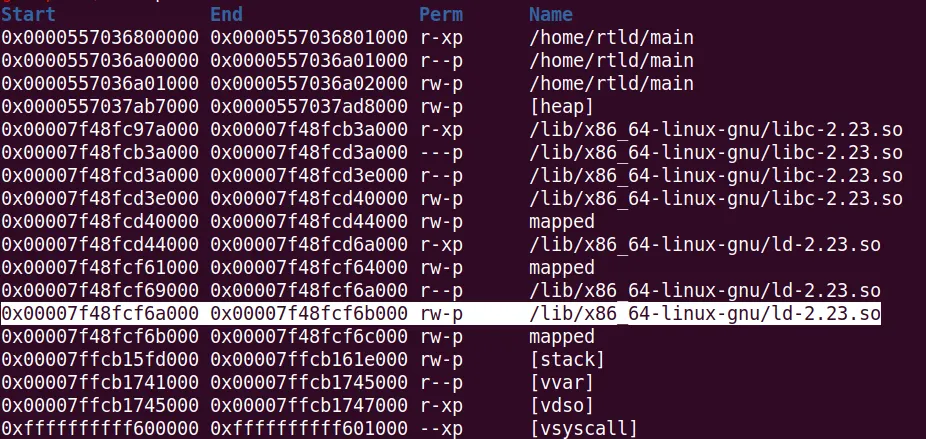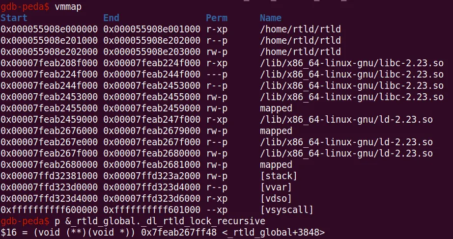 _dl_rtld_lock_recursive 함수의 위치를 확인해보면 writable임을 확인할 수 있습니다.