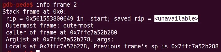 마지막으로 frame 2를 확인해보면 saved rip가 없는 것을 확인할 수 있습니다.
