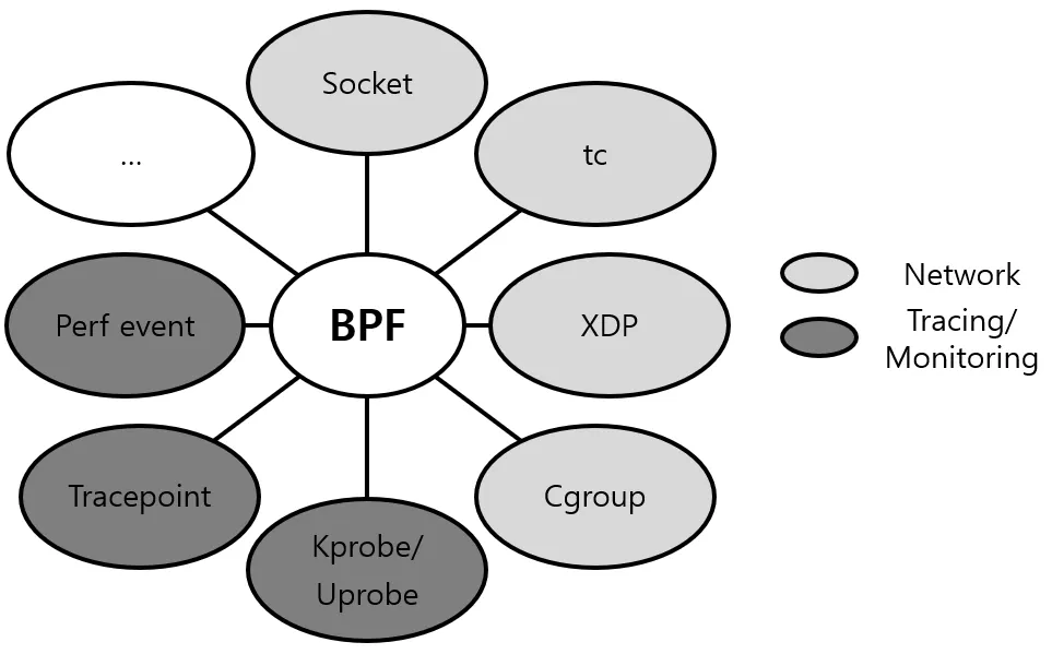 경량화된VM(Virtual Machine)입니다. BPF는 의미 그대로 처음에는 Network Packet을 Filtering하는 Program을 구동하는 용도의 VM이였습니다. 하지만 사용자가 원하는 기능을 수행하는 Program을 언제든지 Kernel Level에서 구동 할 수 있다는 BPF의 장점 때문에 BPF는 꾸준히 발전하였고, 현재는 다양한 기능을 수행하는 VM이 되었습니다. 현재 Linux에서 BPF를 지원하고 있습니다.