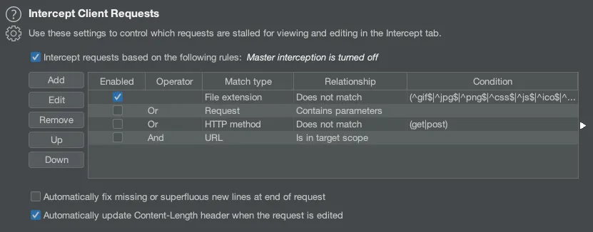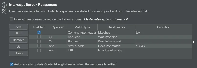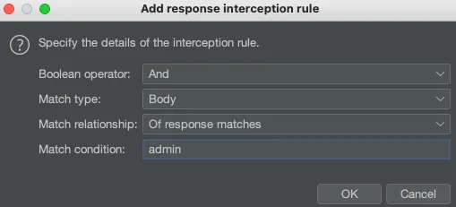 위와 같이 Reponse에서 admin과 같은 정보를 필터링걸어 admin이라는 문자열이 Reponse Body에 포함되어있을때 Intercept가 걸리게 됩니다.