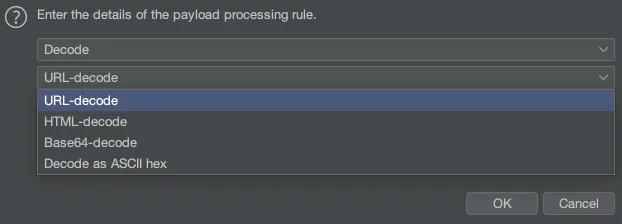 URL, HTML, Base64, ASCII 16진수와 같은 다양한 체계를 사용하여 Payload를 디코딩합니다.