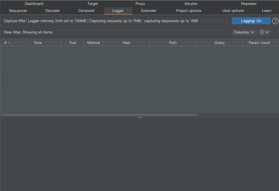 Burp Proxy를 이용하여 수집한 데이터를 기록하고 분석을 하는 메뉴입니다.