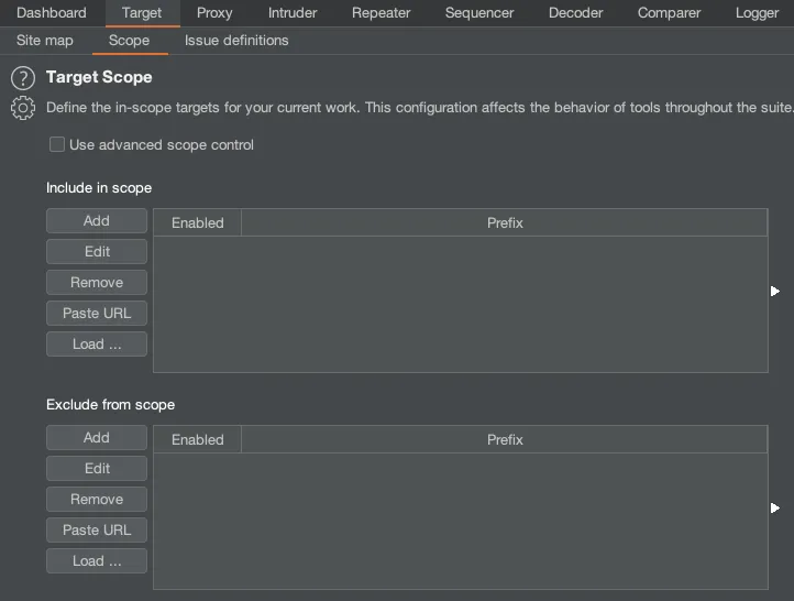 Scope는 Include in scope 탭에서 현재 공격하는 대상 URL에 대해서 정의하고 추가할 수 있습니다.