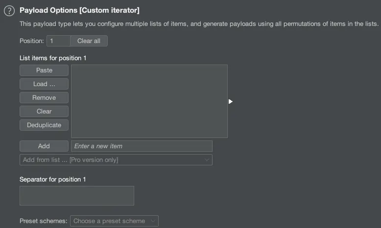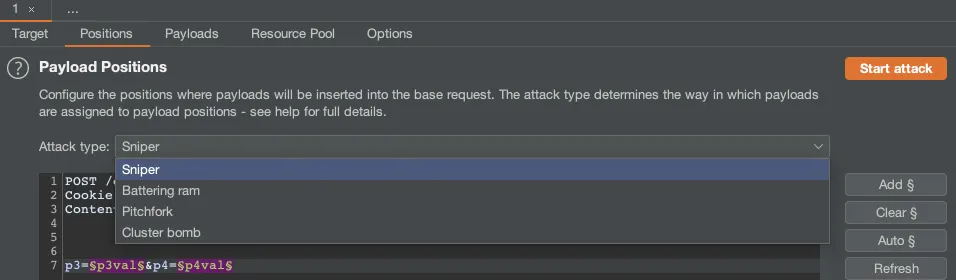 여러개의 Payload Set을 이용하여 각 Attack Vetor에 다른 Payload를 넣어 공격을 시도합니다.