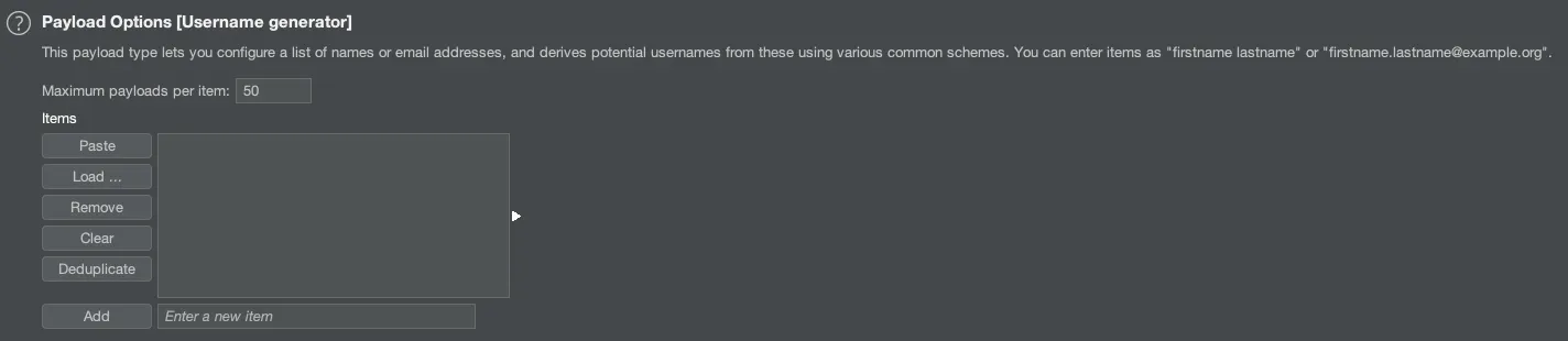 이름 또는 이메일 주소 목록을 Payload로 생성하여 공격할 수 있습니다.