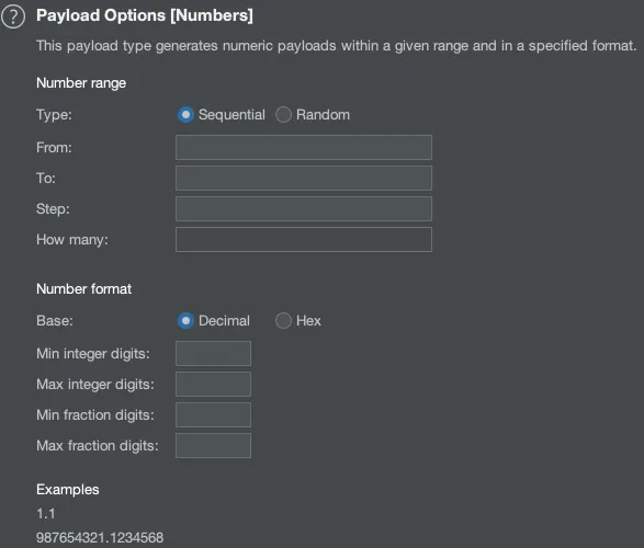 지정된 범위 내에서 지정된 형식으로 숫자 Payload를 생성하여 공격할 수 있습니다.