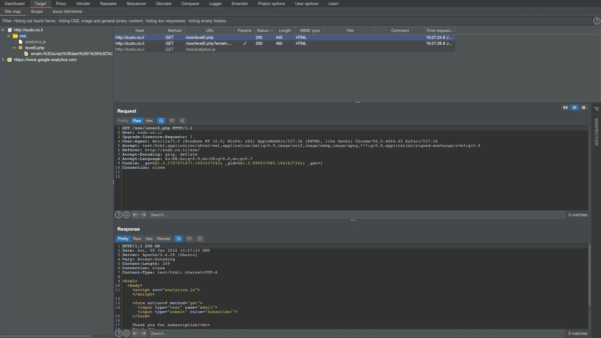 Site Map은 Burp Suite를 이용해 수집한 정보를 Site Map 형태로 보여주고 필터링 및 주석을 이용하여 의미있는 정보를 추출할 수 있습니다.