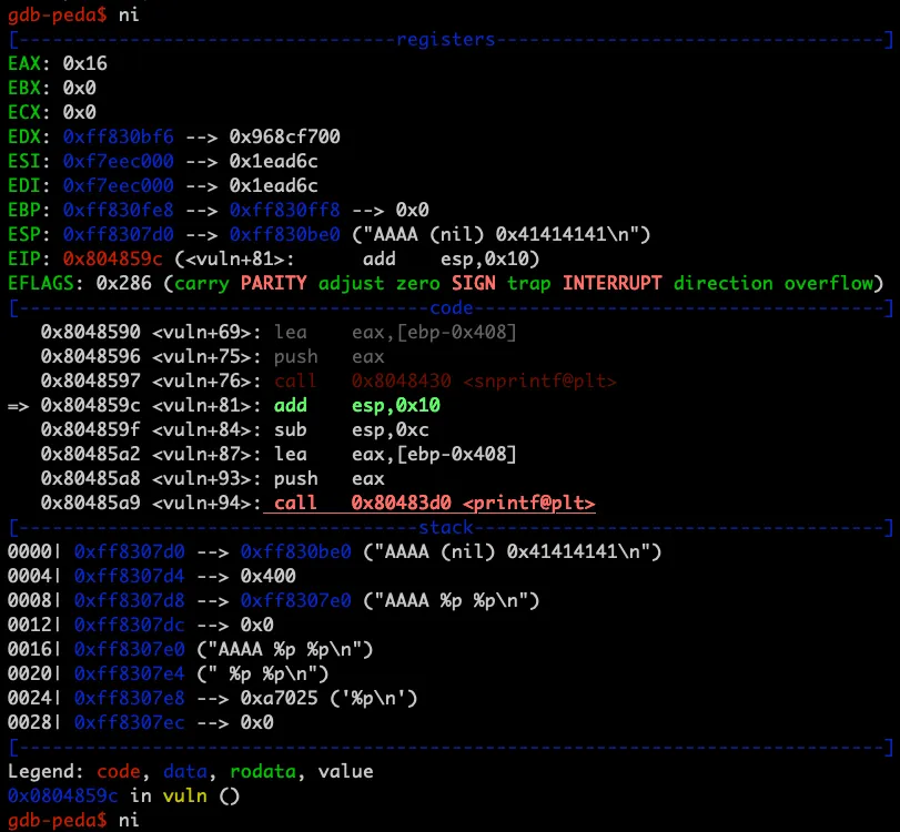 vuln+57~76 : lea eax,[ebp-0x808], push eax, push 0x400, lea eax,[ebp-0x408], push eax, call 0x8048430 <snprintf@plt>