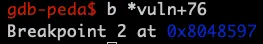 실제로 확인 해본다면 아래의 명령어를 입력하여 vuln+76에 BreakPoint를 걸어줍니다.